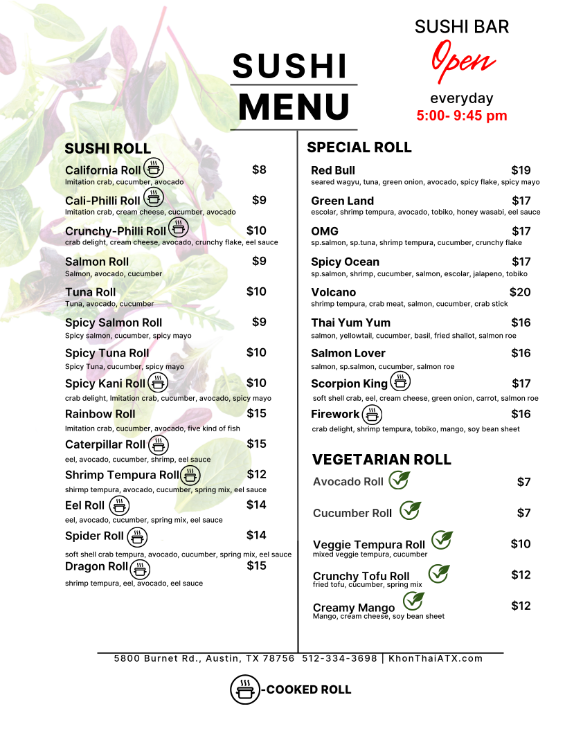 The menu at KHON Thai Kitchen by Seeda features a variety of traditional and contemporary Thai dishes alongside a selection of sushi options. It is organized into several distinct categories to accommodate different dining preferences, offering a range of flavors and ingredients.