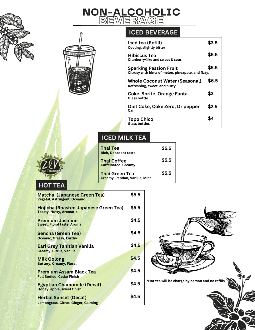The menu is suitable for casual dining occasions, accommodating both quick orders and more leisurely meals. It presents a mix of lighter dishes and more substantial entrees, making it appropriate for lunch, dinner, or when seeking a diverse culinary experience with both Thai and Japanese influences. Beverage options include traditional Thai drinks that complement the food selections.
